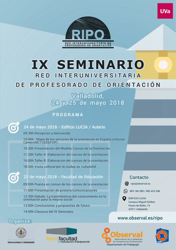 La finalidad de la Red Interuniversitaria de Profesorado de Orientación (RIPO), creada en noviembre del 2009, es generar un espacio de debate e intercambio de experiencias y conocimientos científicos de profesorado e investigadores/as universitarios/as en materia de orientación educativa y profesional. En este sentido, desde sus inicios se ha organizado un seminario o reunión anual, en el que profesorado e investigadores procedentes de distintas universidades nos encontramos para analizar, discutir y hacer propuestas referidas a algunos de los ejes temáticos de la red.